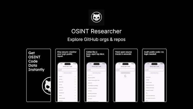 OSINT Researcher is a lightweight, high-signal app for exploring the public GitHub footprint of any organization, purpose-built for open-source intelligence, security audits, recruiting, and collaboration discovery. Enter an org name to instantly enumerate public repositories, then search and filter by language, recency, or contributor to focus on the most relevant targets. With direct access to contributor profiles, it becomes easy to evaluate real code, identify experts, and find collaborators across ecosystems.