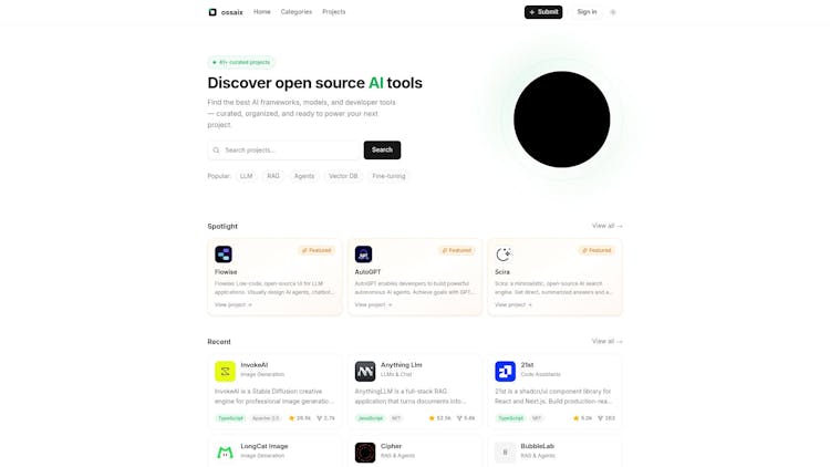 OSSAIX is a curated directory of open source AI projects, frameworks, and tools designed for developers building intelligent applications. Explore 40+ hand-picked projects across categories including RAG & Agents, LLMs & Chat, Code Assistants, and more. From Flowise's low-code agent builder to AnythingLLM's document chatbots, discover production-ready tools that power your next AI project. Search by framework, browse by category, or submit your own open source AI project to join our growing community of builders.