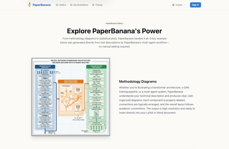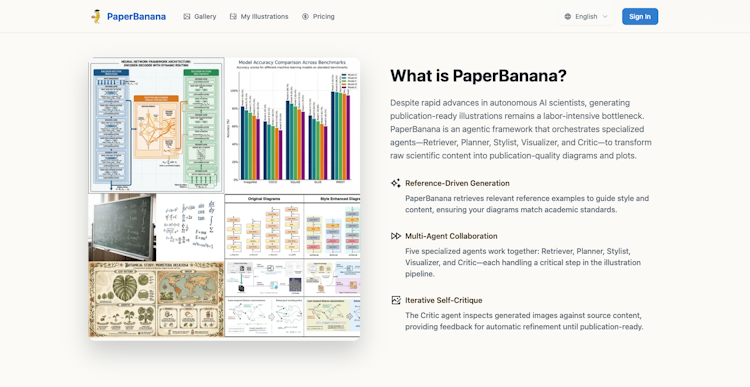 PaperBanana: The AI Expert for Automating Academic Illustration PaperBanana is an agentic framework designed specifically for researchers to solve the "illustration bottleneck" in paper writing. It automatically transforms your raw research content—whether it's complex methodology text, experimental data, or rough hand-drawn sketches—into publication-quality illustrations that meet the standards of top-tier venues like NeurIPS and ICML.