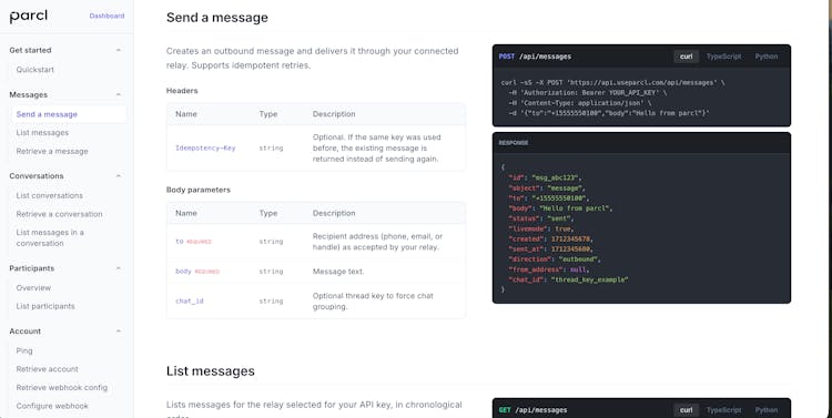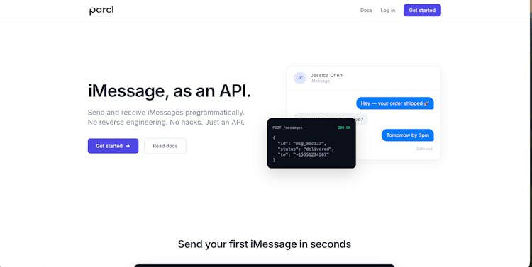 Parcl gives developers a powerful way to build with iMessage: send and receive messages through a clean API, trigger real-time webhook events, and access full conversation history in one place. From order updates to support flows and notifications, Parcl helps you ship iMessage features in hours not weeks.