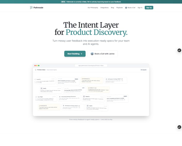 Pathmode is the Intent Layer for Product Discovery. Paste support tickets and user research into the Evidence Board, let AI synthesize structured intent specs, and push execution-ready specs to Cursor, Claude Code, Linear, and Jira. Every spec traces back to real user friction — so you build the right thing, not just the next thing.
