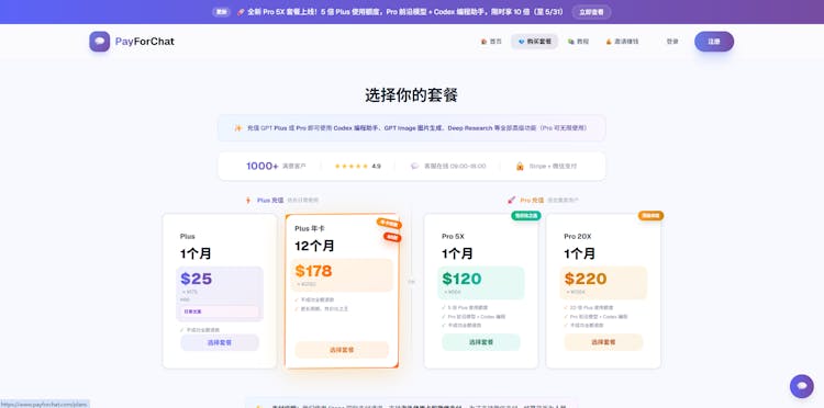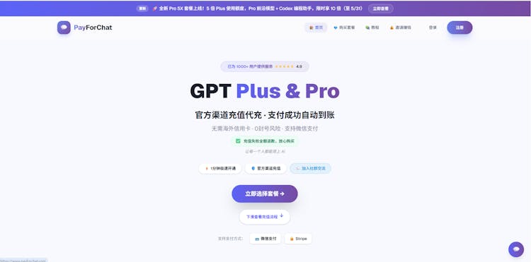PayForChat helps international users subscribe to ChatGPT Plus and Pro without needing an international credit card. We handle the complex payment process through our secure 3-step checkout, with activation completed in about 1 minute. Multiple payment methods supported. Full refund if activation fails. Plus from $25/month, annual $180 (40% off). Over 2,000 users served since launch.