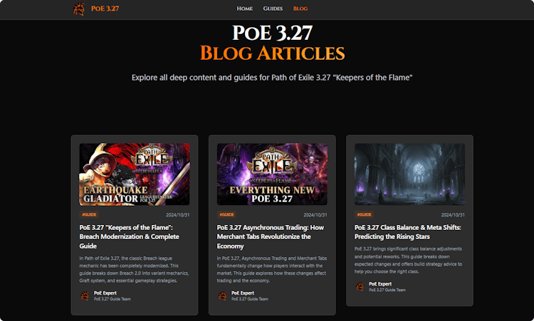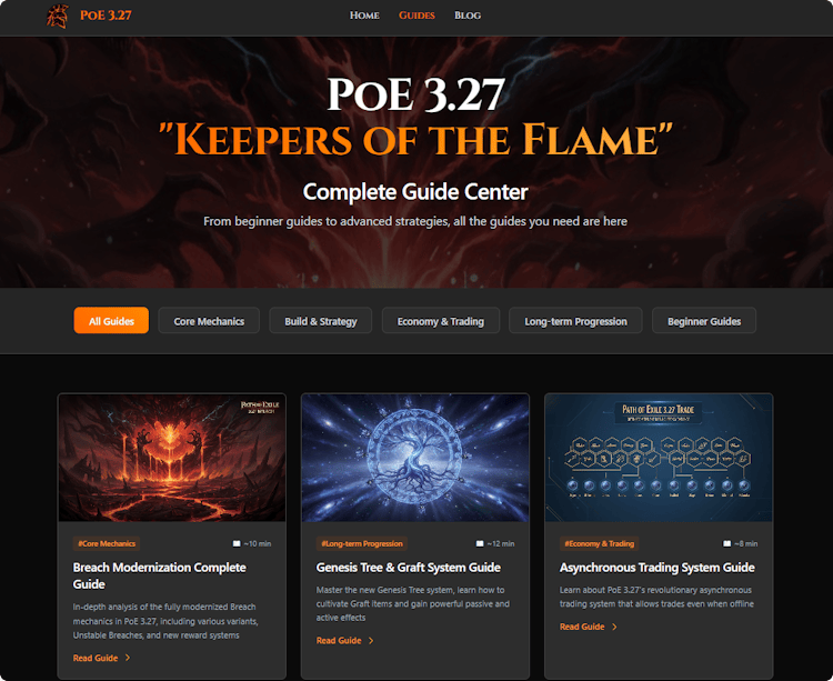This is a comprehensive fan-made guide website for Path of Exile 3.27 "Keepers of the Flame" expansion. The site provides in-depth analysis, strategy guides, and complete walkthroughs for all new game mechanics, systems, and features introduced in PoE 3.27.