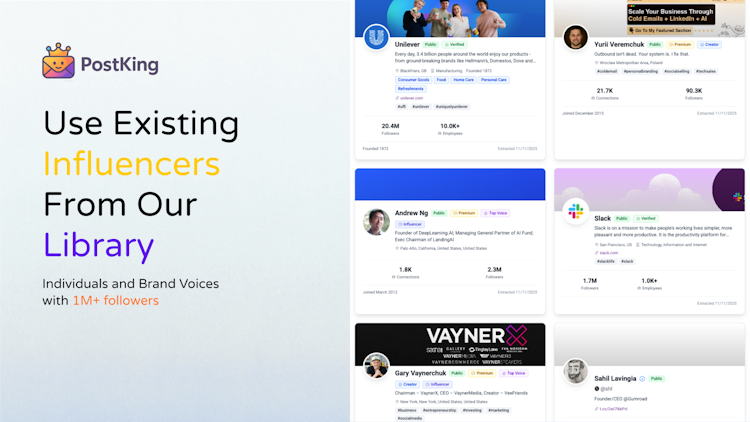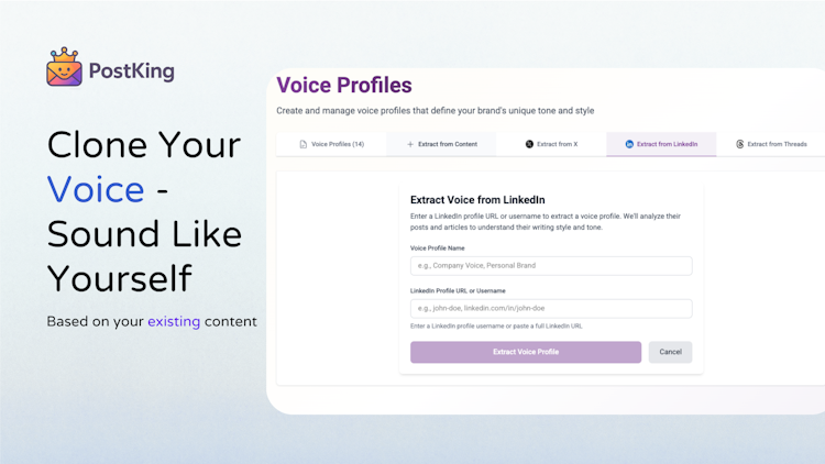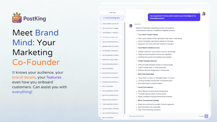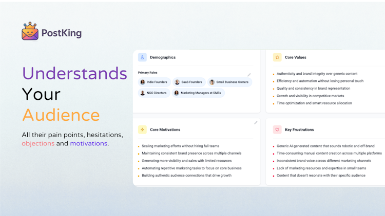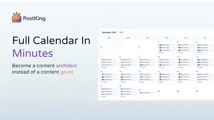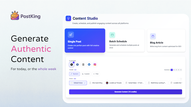 Stop being a grunt of the algorithm. Become the architect of your content. PostKing generates brand-authentic content across social media, landing pages, blogs, and SEO-optimized articles while preserving your unique voice. Features: multi-channel calendar, automated scheduling, asset library, deep voice analysis, team collaboration, and content that actually converts. No quick-to-fame tricks, just aligned content to connect with your audience. Scale your content without losing your soul.