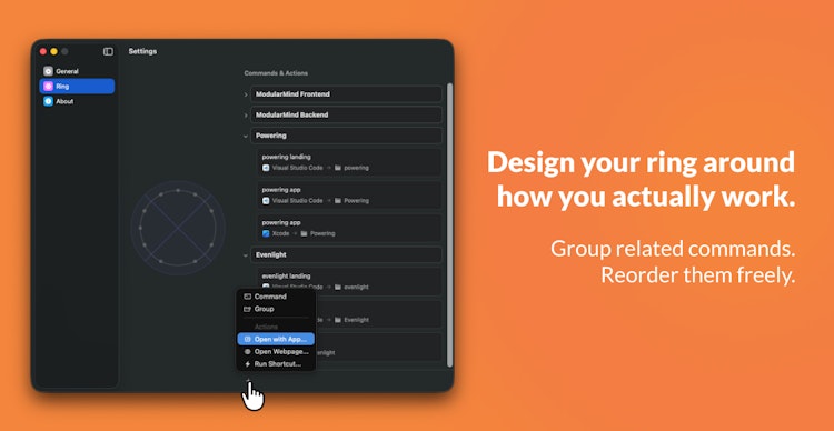 Powering gives you a customizable ring of actions, a circle of commands you control, so you can launch anything instantly. Double-tap Option and your personalized command wheel appears — a ring of actions you control. Launch anything instantly. No searching. No dock hunting. No context switching. Projects. Folders. Websites. Scripts. Shortcuts. AI workflows. All within reach. All in one gesture.