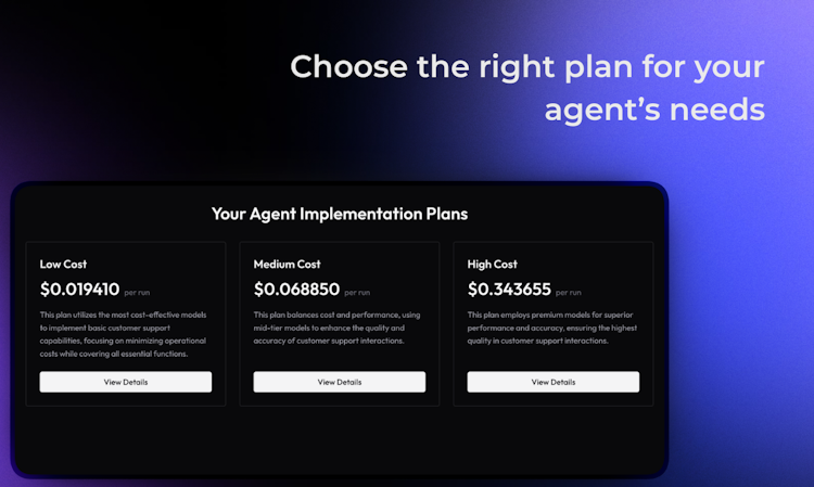 Free AI agent cost calculator. Compare three implementation plans with detailed breakdowns, model selections, and accurate pricing for your project.