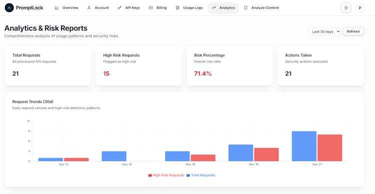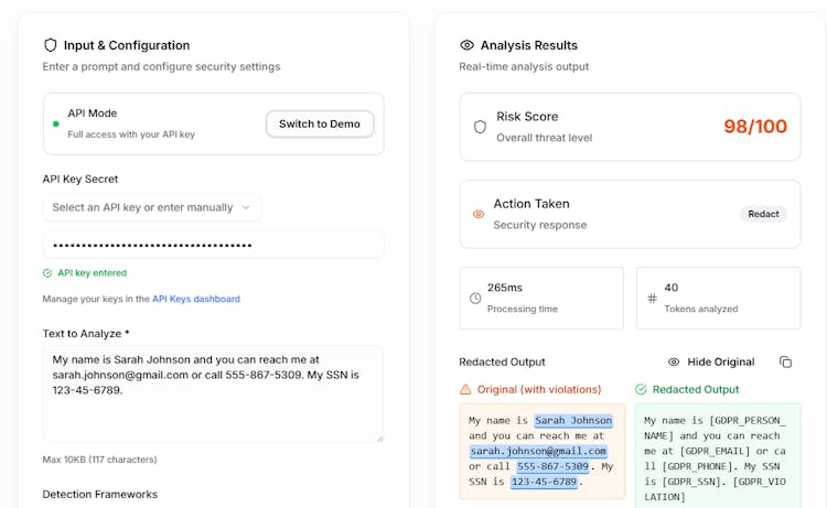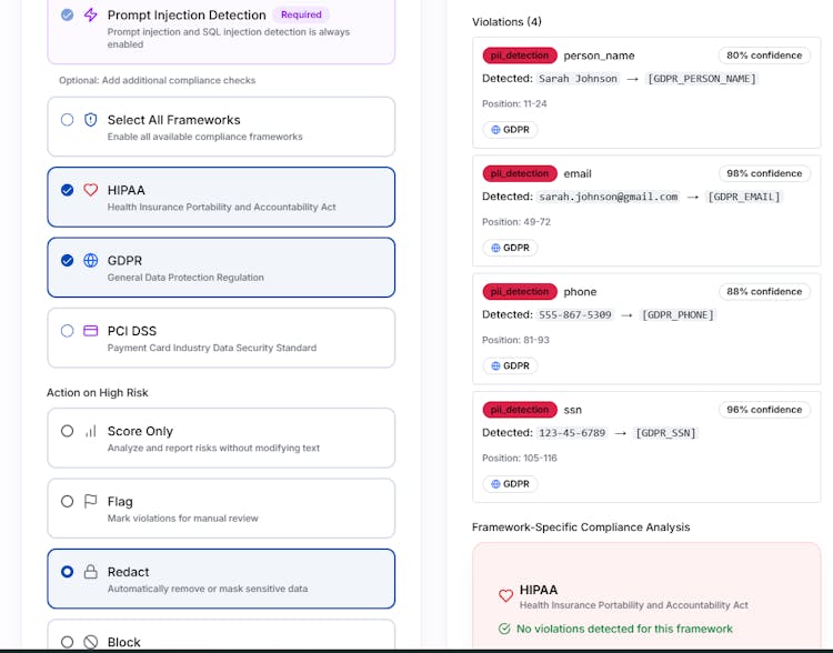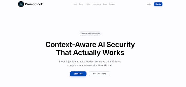 PromptLock scans user inputs before they hit your LLM. Detects prompt injection attacks with 98% accuracy and automatically redacts PII/PHI based on compliance context (HIPAA, GDPR, PCI). Single API endpoint, ~100ms response, free tier with 3K requests/month. Integrations for n8n, Flowise, Bubble, and Retool.