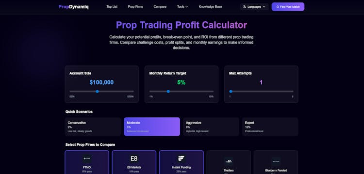 PropDynamiq is an AI-powered platform that helps traders discover and compare proprietary trading firms based on their strategy, goals, and risk profile. It simplifies decision-making with clear comparisons and built-in tools like profit and risk calculators.