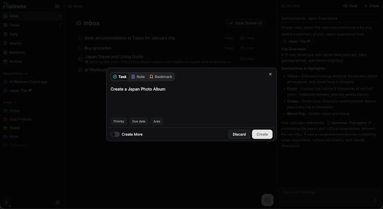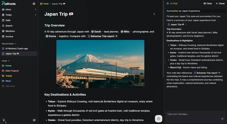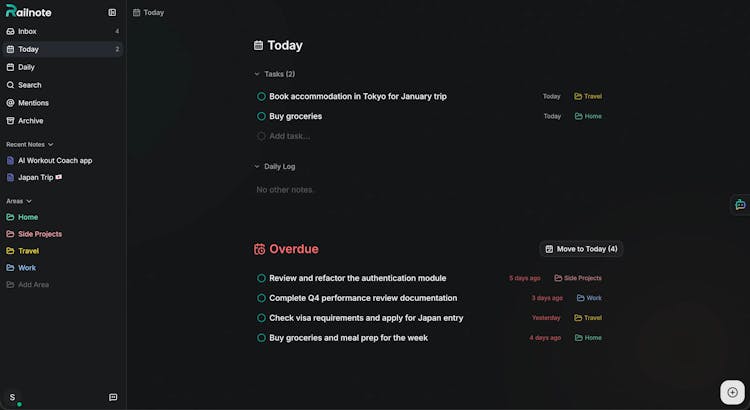 Railnote puts your tasks, notes, bookmarks and habits in one clean feed. Capture anything instantly with Quick Capture. Focus on what matters with Today View. AI helps you write, search and organize your content. Simple enough to use daily, capable enough to replace four apps.