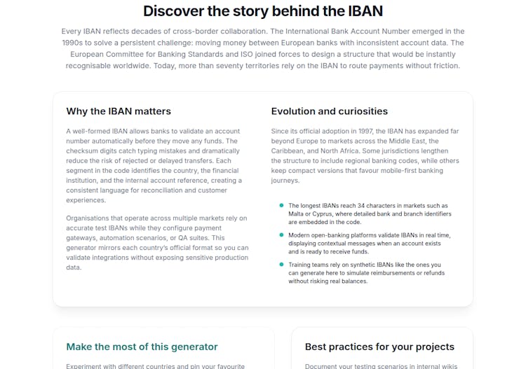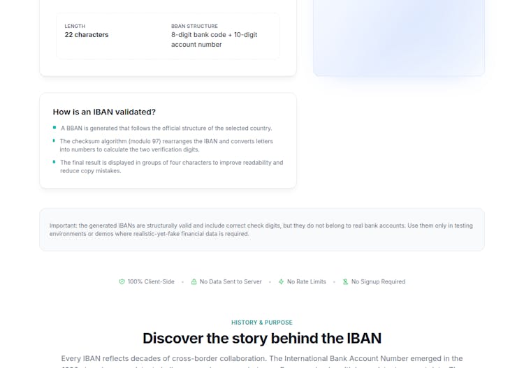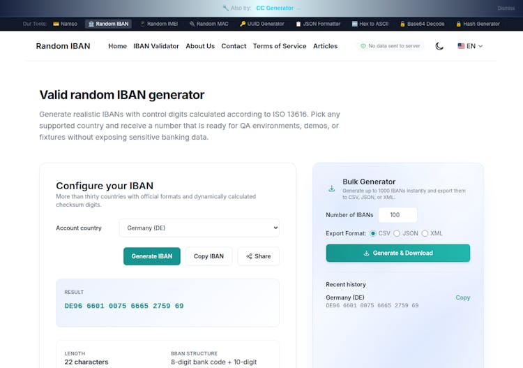 Generate random valid IBAN numbers for testing payment systems and banking integrations. Supports 70+ countries with proper formatting and check digits. Built for fintech developers and payment integration testing.
