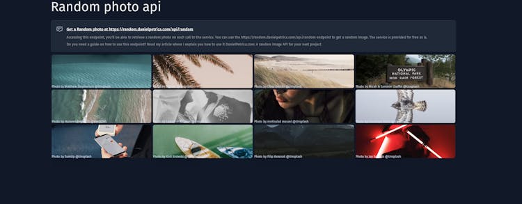 Accessing this endpoint, you'll be able to retrieve a random photo on each call to the service. You can use the https://random.danielpetrica.com/api/random endpoint to get a random image. The service is provided for free as is.