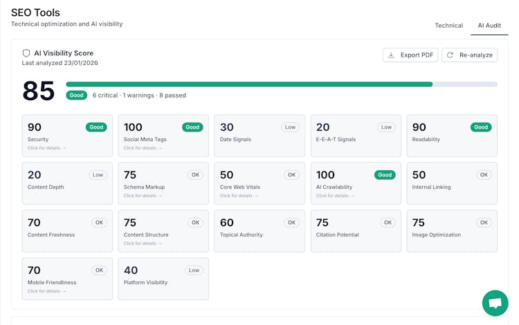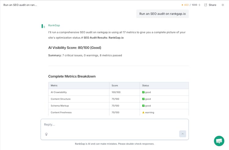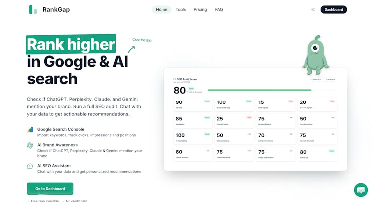 RankGap helps you rank higher in Google and AI search by giving you everything you need in one place. Connect your Google Search Console with a single click to import your keywords and track clicks, impressions, and positions. Check if AI platforms like ChatGPT, Perplexity, Claude, and Gemini are mentioning your brand. Chat with an AI SEO assistant that understands your data and gives you personalized, actionable recommendations. Run a comprehensive SEO audit with prioritized fixes.