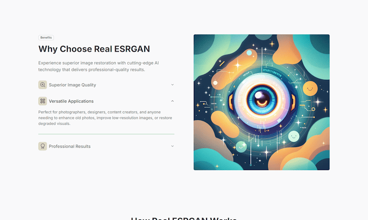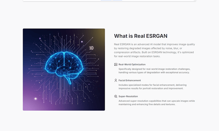 Real ESRGAN is a powerful, AI-based image enhancer. It restores image quality by removing blur, noise, and compression artifacts while boosting details and clarity. Built from the advanced ESRGAN model, it’s been improved to work on real-world, imperfect photos—like old snapshots, low-res downloads, or blurry phone pics. Real ESRGAN can upscale images by 2x, 4x, or 8x, giving clear, realistic results that look much better than older methods. It’s open-source, works with scripts or easy-to-use apps, and many people use it for restoring portraits, improving product photos, or sharpening digital art.