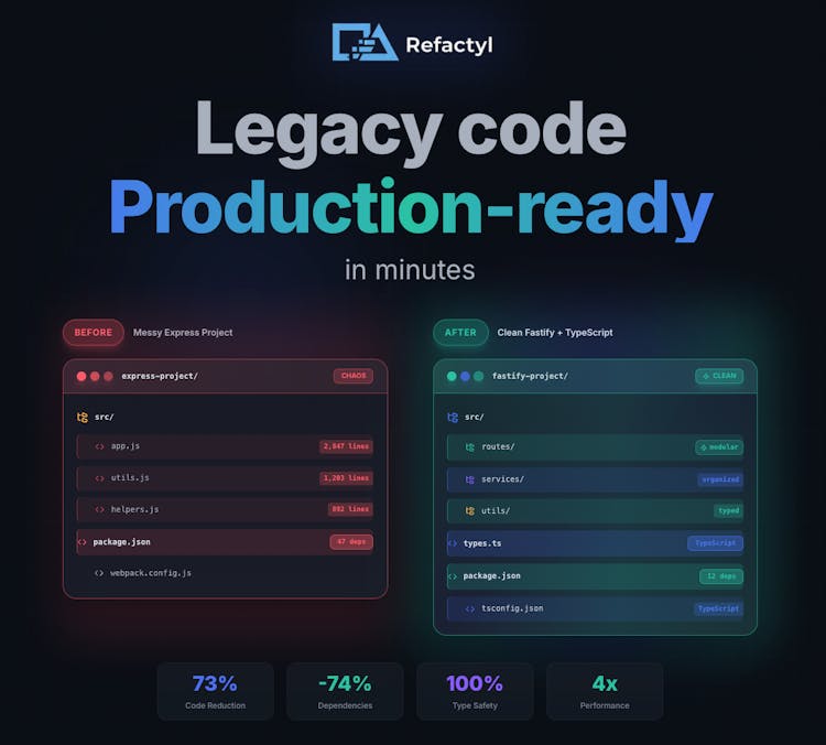 Refactyl is an AI-powered tool that automatically transforms messy, outdated codebases into clean, modern, production-ready projects. 🔁 Migrate frameworks (Express → Fastify, JS → TypeScript) 🧱 Improve structure for scalability & maintainability 🧹 Reduce technical debt without manual refactoring ⚡ Save hours of repetitive engineering work Built for developers dealing with legacy code who want to ship faster with confidence.