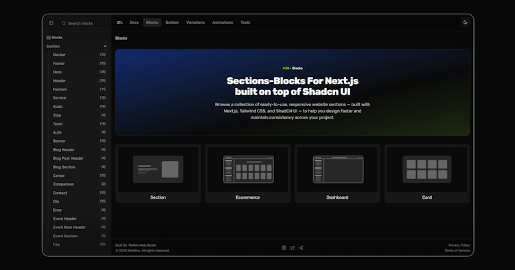 A collection of prebuilt, type-safe UI section blocks for Next.js, built on top of Shadcn/UI — accelerate your development workflow with ready-to-use, customizable blocks.