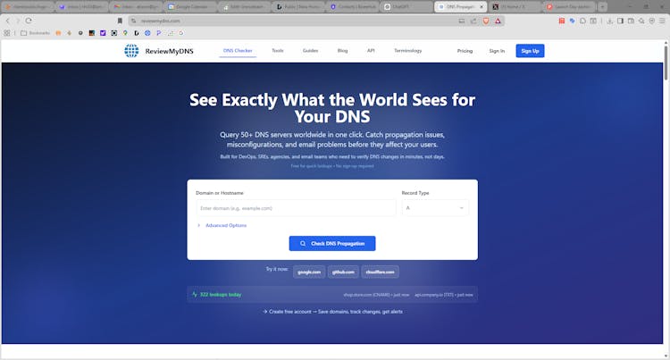 Free DNS propagation checker for DevOps teams. Query 50+ global servers to verify A, MX, CNAME, TXT, NS records. Interactive world map, DNSSEC validation, bulk lookup, and 40+ provider setup guides. No signup required.