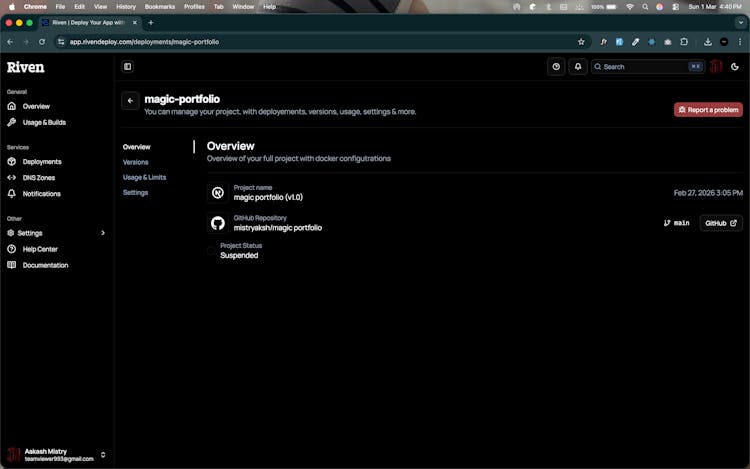 Riven Deploy automates full-stack application deployment by detecting project type, generating Docker-based environments, managing live instances, streaming deployment logs, and tracking bandwidth usage all through a developer-friendly platform.