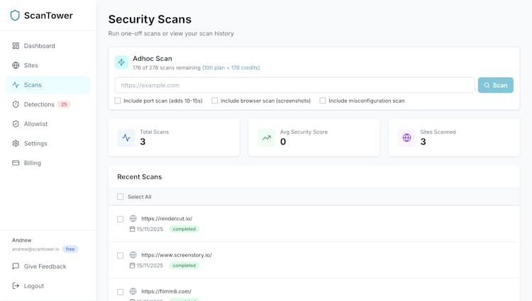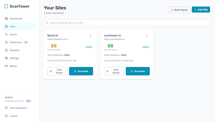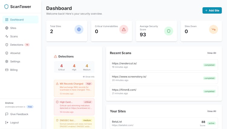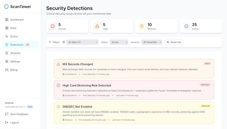 ScanTower gives real, external security visibility like an attacker sees it: headers, misconfigs, vulnerable CMS/plugins, forgotten subdomains, SSL/TLS issues, domain takeover risks, and malicious scripts - including card skimmers. Alerts notify you when things change, so you can fix problems before breaches.