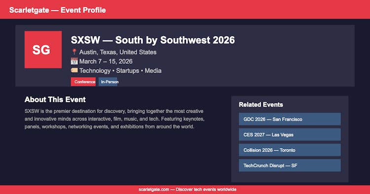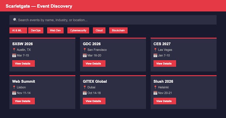 Scarletgate is a free, open discovery platform for tech events — conferences, summits, expos, meetups, and hackathons. Filter by industry, event type, location, and attendee role. Built with React, Supabase, and Vercel. Designed for developers, founders, and tech professionals who want to find relevant events without wading through noise.