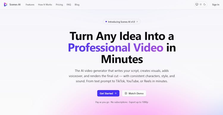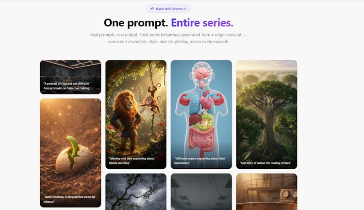 Scenes AI is an AI video generator handles every stage of video production in one seamless pipeline. Start with a plain-language description of your idea — the topic, tone, audience, and length — and the platform's 8-phase engine writes the script, breaks it into scenes, generates visuals, synthesizes voiceover, scores music, and renders the final MP4. You review and approve at key checkpoints, staying in creative control without touching a timeline or learning a single editing shortcut.