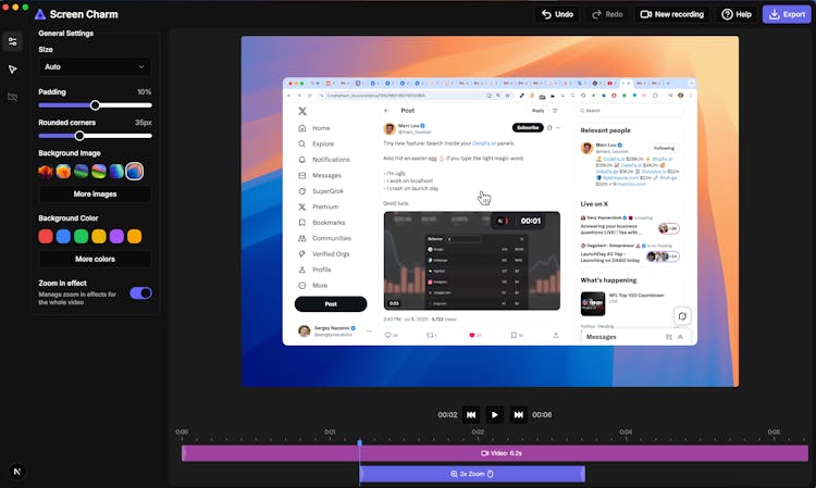Screen Charm turns your Mac into a professional-grade recording studio, letting you craft high-definition, engaging videos in minutes. Whether it's for training, product showcases, or content creation, it’s built to impress. Featuring intelligent zoom on key actions, natural cursor flow, webcam compatibility, and customizable backgrounds, your videos are instantly polished with no need for editing afterward.