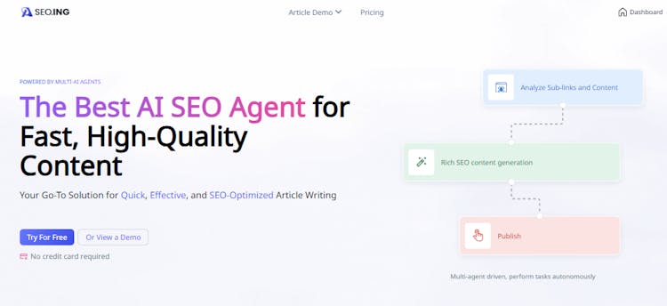 Let AI Agents Write Your SEO Content. Two clicks to high-ranking articles. Our AI team crawls websites, creates outlines, and generates articles with images and tables. - seo.ing