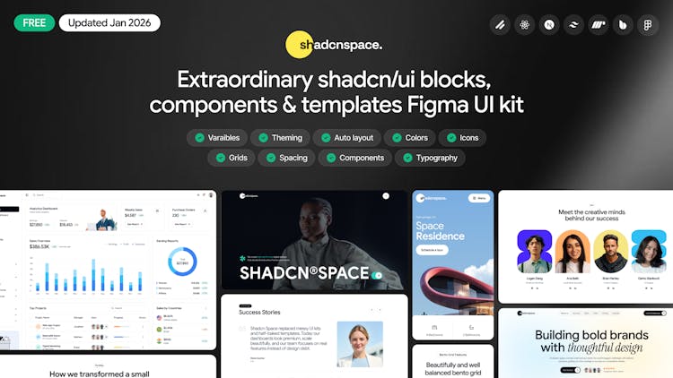 Free Figma UI kit for design handoff, and regular updates with new Shadcn resources. Everything is built with a focus on clean design, developer experience, and zero licensing cost.
