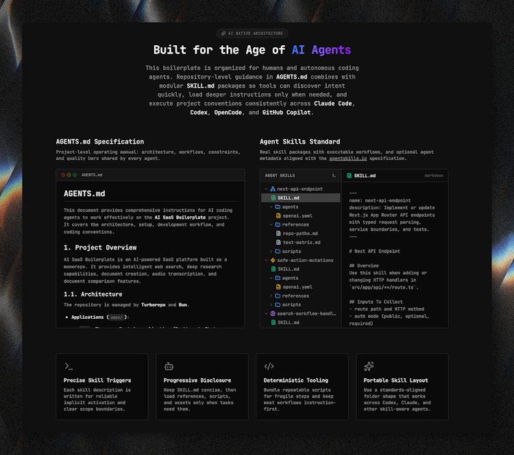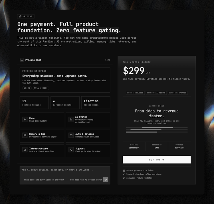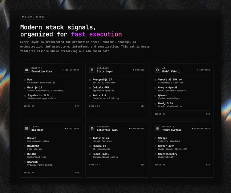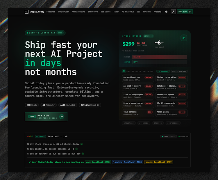 ShipAI.today is a production-ready AI SaaS boilerplate: Next.js + TypeScript + Bun, with auth, billing, usage tracking, background jobs, storage, observability, and an AI orchestration + memory/RAG stack already wired for deployment.