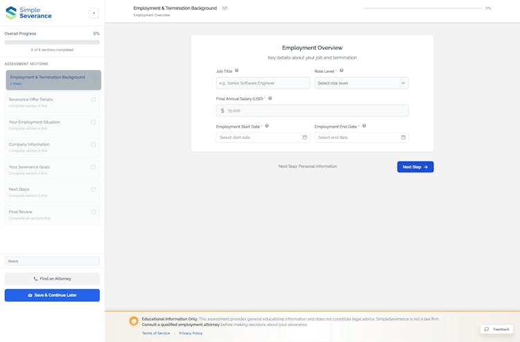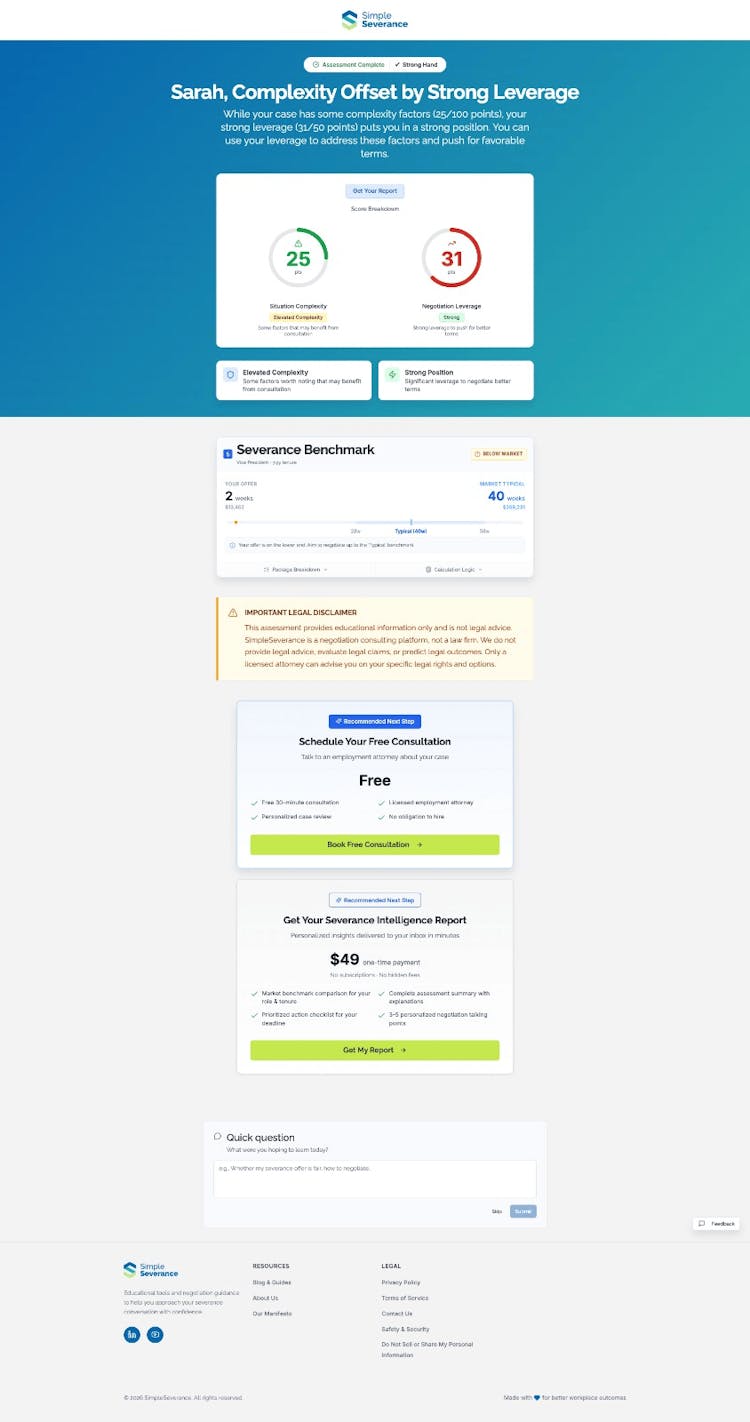 SimpleSeverance is an AI-powered negotiation tool that assists with severance package discussions. The system generates fairness scores for severance offers by analyzing multiple factors including tenure, position, and industry standards, helping individuals make informed decisions about their offers. The software creates customized negotiation scripts based on specific situations, providing appropriate strategies and language for advocating for improved terms. SimpleSeverance also facilitates connections with employment attorneys for legal support when needed. Designed specifically for severance negotiations, SimpleSeverance combines analytical capabilities with personalized guidance. The platform integrates AI analysis with practical negotiation resources, creating a comprehensive approach to severance discussions that helps individuals navigate this challenging process with greater confidence and clarity.