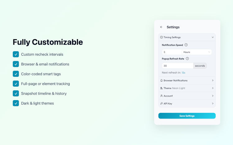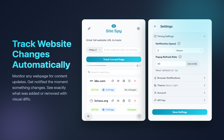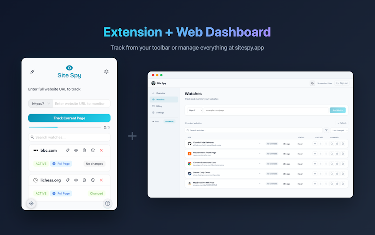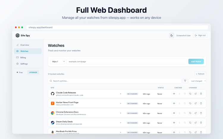 Site Spy monitors websites for changes automatically. Add any page from the browser extension (Chrome & Firefox) or web dashboard, and get notified the moment content updates. See exactly what changed with visual diffs — additions in green, removals in red. Track specific elements like prices or headlines with the built-in element inspector. Color-coded tags, snapshot timelines, and MCP server integration for AI assistants. Free plan included — no credit card needed