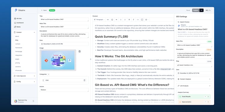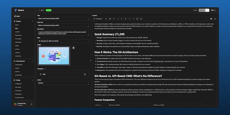 Sitepins is a Git-based headless CMS that lets non-technical people (clients, marketers, content teams) edit website content through a visual editor—without touching code or bothering developers.