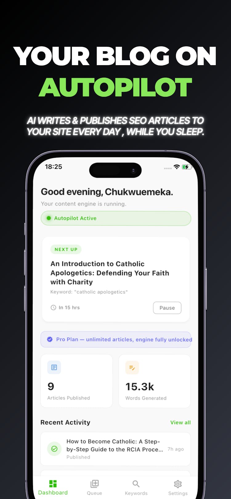 - Uses Gemini AI to generate, schedule, and auto-publish 1,500+ word articles.