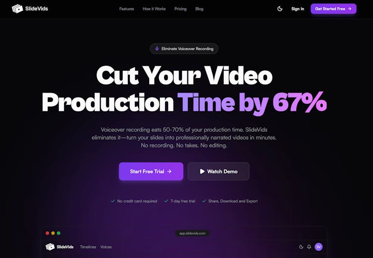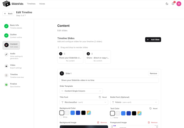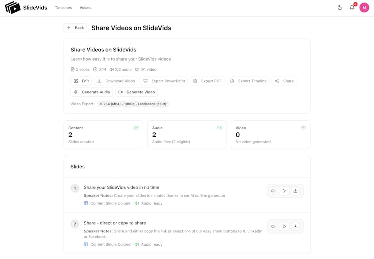 AI-powered platform that generates complete slide decks with narration—ready to export. No recording. No editing. Just professional videos from your ideas. Create timelines with customizable layouts, colors, and fonts. Generate AI-powered audio narration using multiple TTS providers. Render professional videos with Remotion.