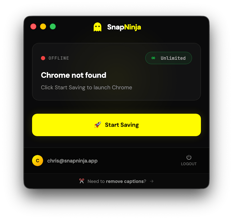 SnapNinja runs on your Mac or Windows PC and connects to Snapchat Web through Chrome. It intercepts media before Snapchat's detection system activates, saving content directly to your computer with no cloud uploads and no notifications sent.