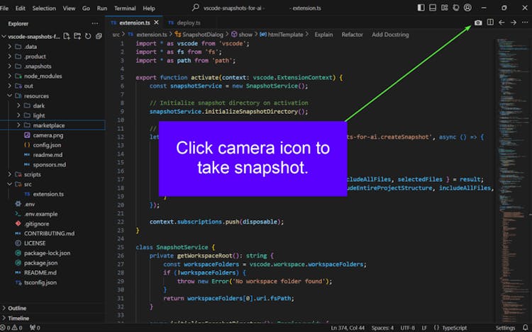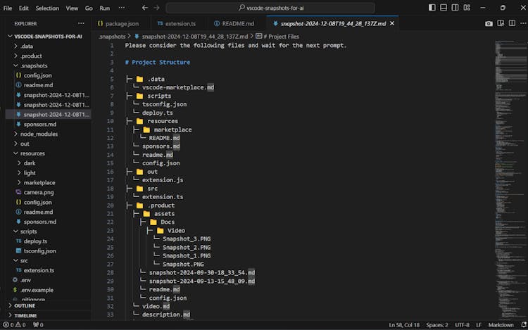 Create perfect code context for AI interactions! Snapshots for AI is a powerful VS Code extension that helps you generate well-formatted markdown snapshots of your code, making it easier to share context with AI assistants like ChatGPT, Claude, and others.