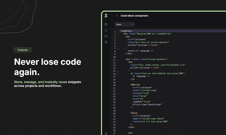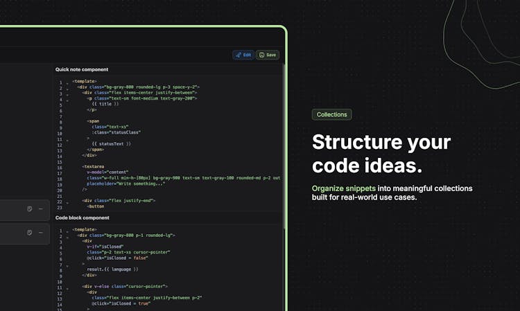 Snipplle is an open-source snippet management platform built with Vue, designed to help developers create, organize, and manage code snippets in a structured way.