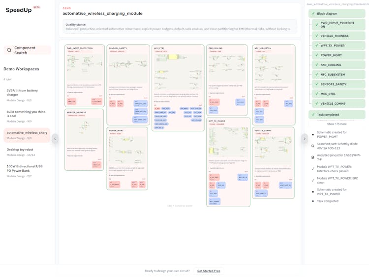 SpeedUp lets you skip the tedious manual work of circuit schematic design. Just type in what your product needs to do, attach any relevant component datasheets, and the AI handles the rest — generating a structured block diagram, designing each module's schematic, and running electrical rule checks along the way. You can review and refine the block diagram before the AI proceeds, so you stay in control without doing the heavy lifting. When the design is ready, export a complete KiCad project in one click. Whether you're an experienced hardware engineer looking to speed up prototyping or a maker bringing a new idea to life, SpeedUp cuts the path from concept to schematic from weeks down to minutes.