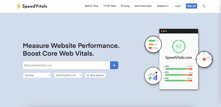 SpeedVitals is a powerful website testing tool aimed at improving Core Web Vitals. It uses Google Lighthouse to measure Lab Data and Chrome's User Experience API to measure Field Data, providing performance insights to help improve your website's speed, irrespective of the platform or technology the website is built on.