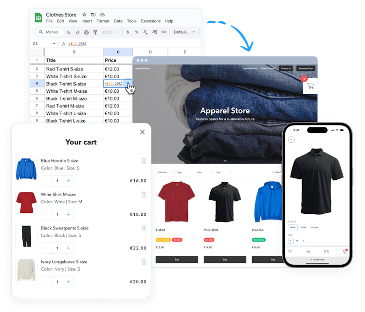 Forget complicated databases and coding. With SpreadSimple, you can manage your entire site's content—products, prices, images, and text—right from the familiar interface of Google Sheets. And now, the process is even faster with the integration of AI, helping you generate content, optimize layouts, and build your dream website in record time.