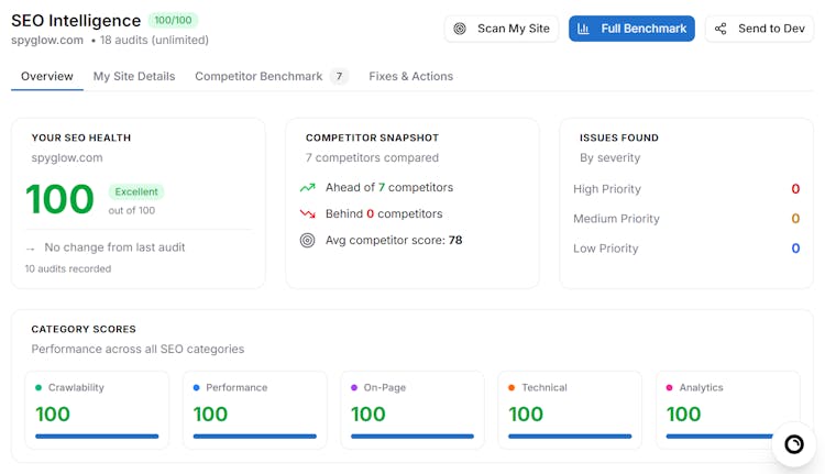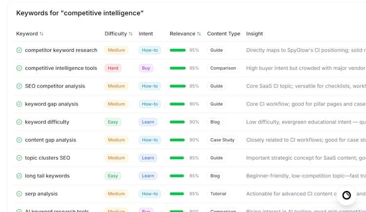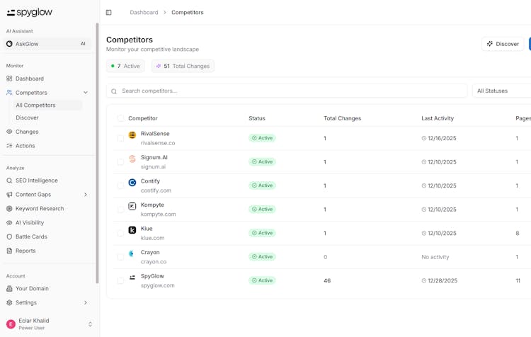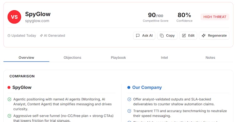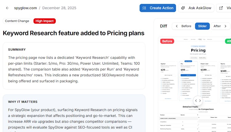 SpyGlow automatically monitors your competitors’ pricing, features, messaging, and SEO — then turns changes into actionable battle cards, content gaps, keyword opportunities, reports, and tasks via AskGlow Agent.
