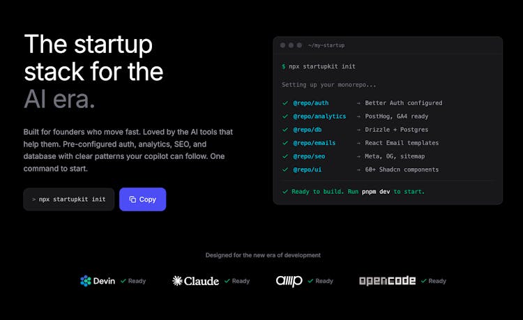 Built for founders who move fast. Loved by the AI tools that help them. Pre-configured auth, analytics, SEO, and database with clear patterns your copilot can follow. One command to start, add new apps, and AI automation (ralph-wiggum loop)