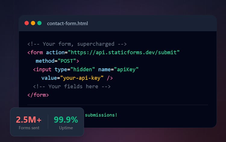 Stop wrestling with backend code. Add working contact forms to any static website in 60 seconds. Spam protection, email delivery, webhooks - all included.