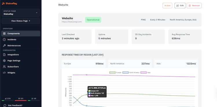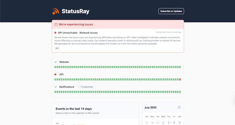 You know what happens during an outage - support gets buried in tickets, customers get angry, and your team scrambles to update everyone. StatusRay fixes that mess. Set up a status page that tells customers exactly what's happening. When something breaks, update one place and everyone knows. Email notifications go out automatically. Support can focus on real problems instead of copy-pasting the same response 100 times. It takes minutes to set up, looks professional, and costs way less than those enterprise tools. No per-subscriber fees, no complicated setup, just a simple way to keep customers informed when things go wrong.