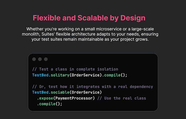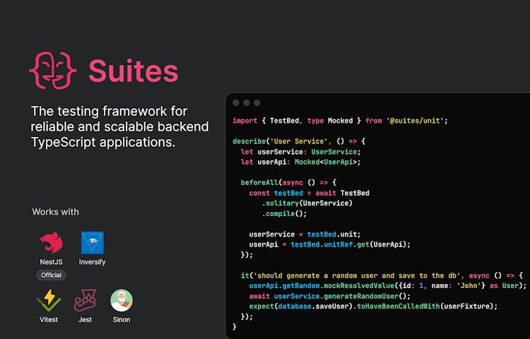 Suites is fully open-source, trusted by teams at enterprises like Monday and Lemonade, works seamlessly with NestJS, InversifyJS, Jest, Sinon, and Vitest, and with 500K weekly downloads on npm.