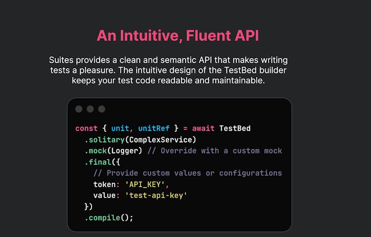Suites is a unit-testing framework for TypeScript backend systems working with dependency injection It provides a declarative, type-safe API that eliminates manual mocking and boilerplate.