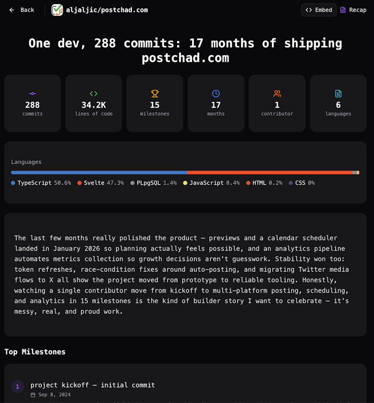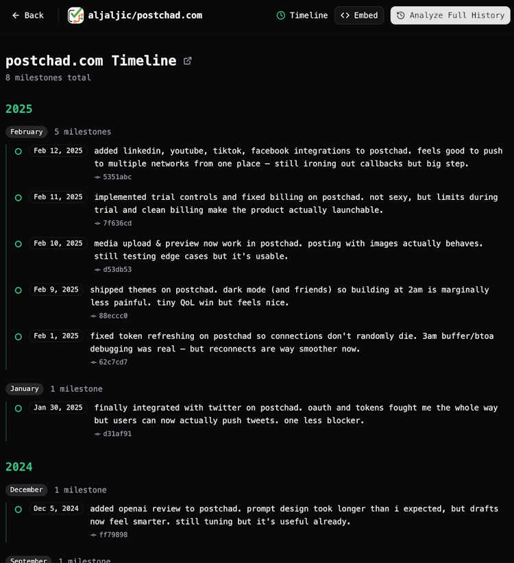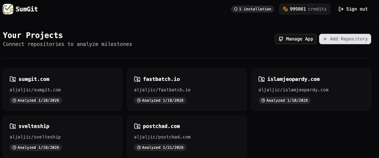 SumGit turns your Git history into shareable product updates. It analyzes your repo to surface meaningful updates—features, fixes, releases—and transforms them into milestones, timelines, recaps, and story-style updates you can share or embed. Perfect for startups, indiehackers and founders that want to keep thier users in the loop.