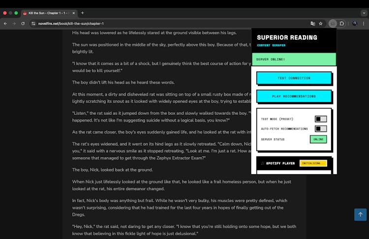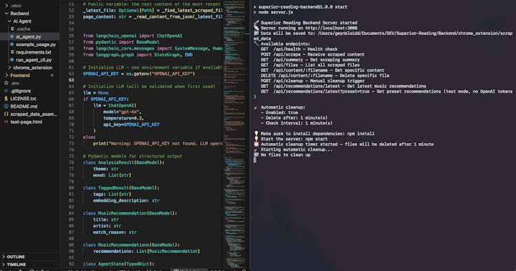 Superior Reading is a Chrome extension and local-first backend architecture designed to bridge the gap between digital text and auditory atmosphere. By leveraging a LangGraph-orchestrated AI agent, the platform performs a multi-stage analysis of web content to generate and synchronize a context-aware Spotify soundtrack in real-time.