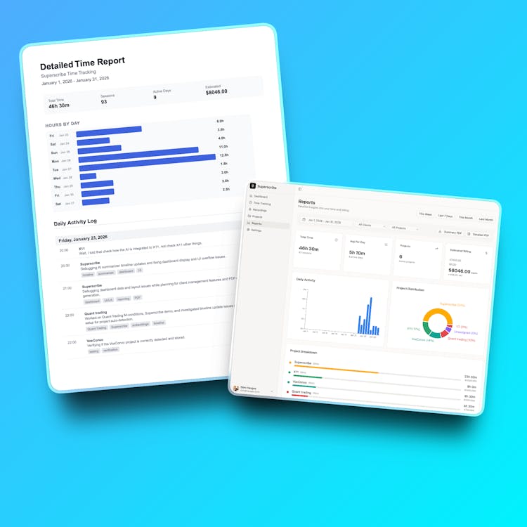superscribe.io turns your voice into text instantly with ~150ms latency, powered by Eleven Labs Scribe v2. But it goes beyond basic dictation: it automatically tracks how long you spend on each task while you talk.