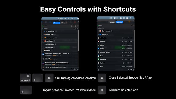I have a bad habit that I always end up with dozens of browser tabs and apps open at the same time. It gets so messy that finding one specific website becomes a nightmare. So I developed a extension + macOS menu bar app for myself and after using it for a while, I found it is much more better than I expected, so I decided to package it and release it as open source, completely free!