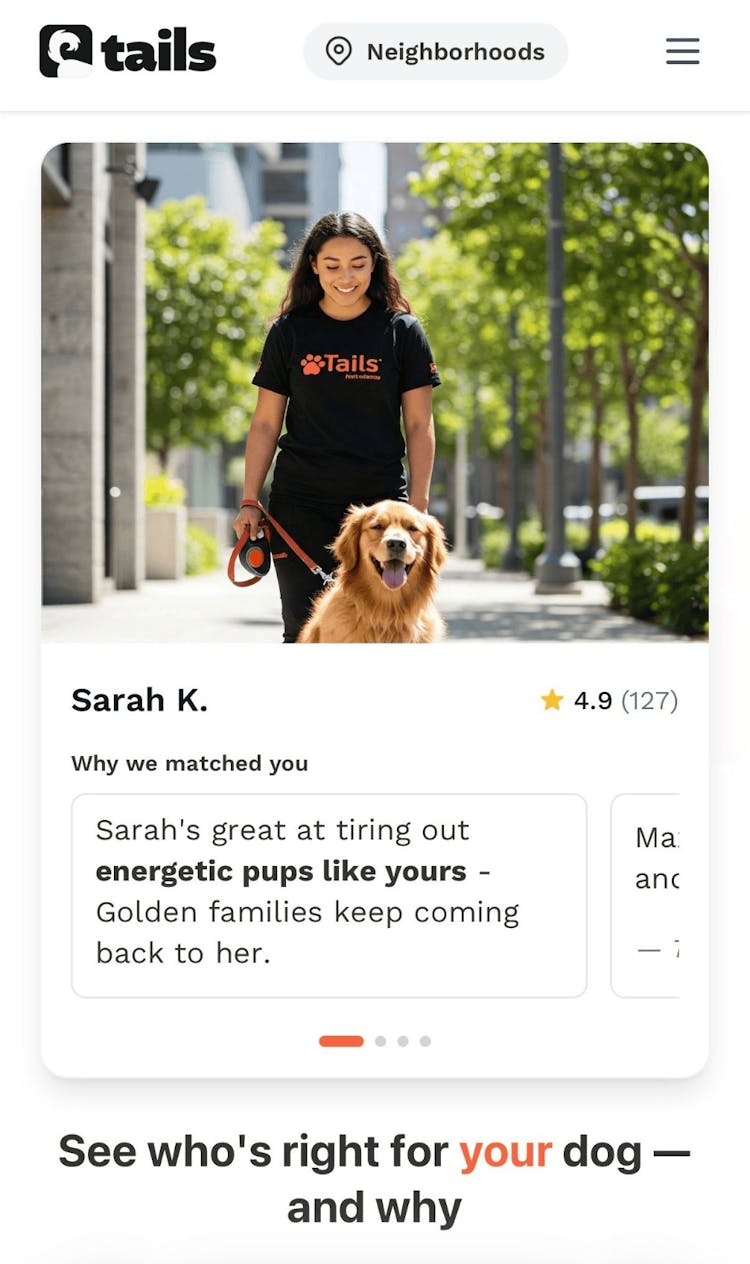 Tails, Co. is the first AI-curated marketplace for dog walking and pet sitting. The platform uses AI to understand each pet's specific needs and match them with dog walkers and pet sitters who have proven success in those exact scenarios—and explains why. Built to bridge the "trust gap" between conscientious pet parents and pet care professionals, Tails replaces the "endless scroll" with precision matching. Headquartered in Chicago, Tails finds the right fit for every pet, every time—at tryTails.com.
